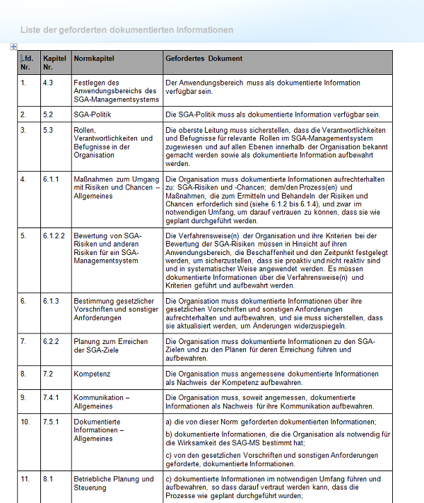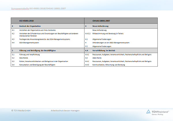 Nach nunmehr fünf Jahren Arbeit durch das internationale sowie begleitend durch die nationalen Projektkomitees ist am 12. März 2018 die erste internationale Norm für ein Managementsystem für Sicherheit und Gesundheit bei der Arbeit (SGA-MS), die ISO 45001:2018, erschienen. Mit einem solchen Managementsystem lässt sich der Arbeitsschutz optimal steuern. Durch das Implementieren, wirksame Umsetzen, regelmäßige Auditieren und die damit verbundene ständige Verbesserung von definierten Strukturen der Aufbau- und Ablauforganisation können Sicherheit und Gesundheit bei der Arbeit (SGA) nachhaltig gewährleistet werden.