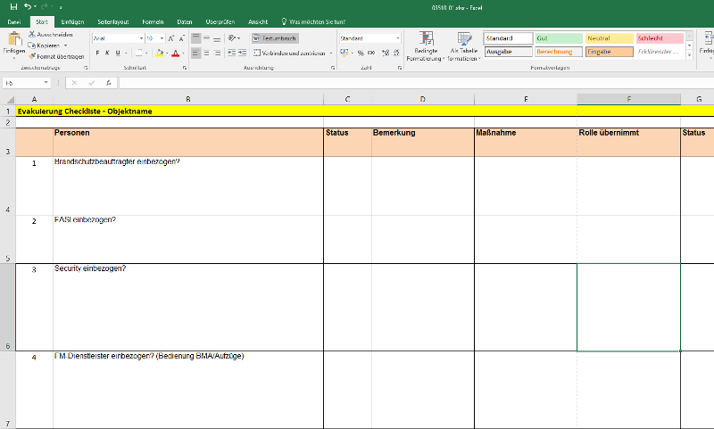 Die beigefügte Arbeitshilfe liefert Ihnen eine Checkliste zur Vorbereitung einer Evakuierungsübung.[ 03510_01.xlsx]