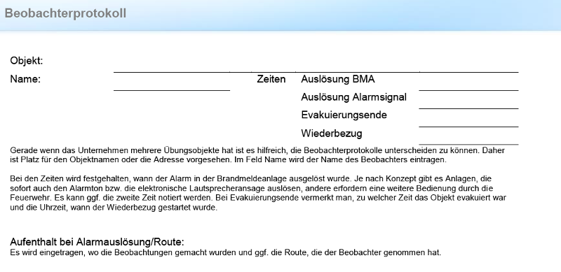 Tag und Uhrzeit der Alarmauslösung sollten bekanntgegeben werden, ebenso die Auslösung von Sicherheitseinrichtungen, die sich in diesem Zusammenhang aktivieren (z. B. Überdruckbelüftungen, die in Sicherheitstreppenräumen dazu führen, dass Türen sich schwerer öffnen lassen, oder Türen in Fluchtwegen, die automatisch entriegeln, damit auch Personen aus einem anderen Sicherheitsbereich den Fluchtweg nutzen können). Wenn dies bei der ersten Übung so praktiziert wird, sorgt dies für eine große Akzeptanz und die Mitarbeiter bekommen einen Einblick in das umfangreiche Aufgabenfeld des Arbeitsschutzes. Bei allen nachfolgenden Übungen kann dann wie auf den kommenden Seiten beschrieben vorgegangen werden.