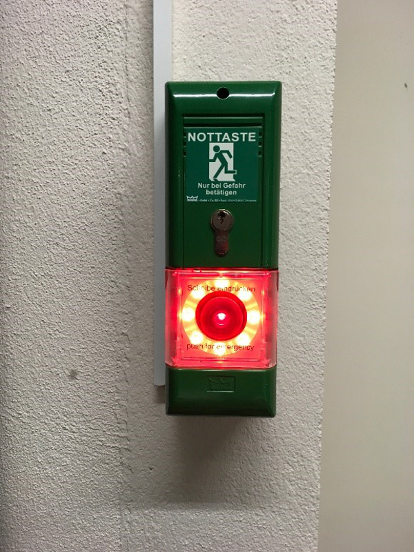 Wenn zum ersten Mal oder nach einer längeren Pause eine Evakuierungsübung geplant wird, sollte offen und transparent mit allen beteiligten Stellen darüber gesprochen werden. Die Führungsebenen sind auf die Pflichtunterweisung der Mitarbeiter in der Brandschutzordnung hinzuweisen. Weiter sollten im Vorfeld alle Mitarbeiter den Fluchtweg vom Arbeitsplatz bis zur Sammelstelle schon einmal abgelaufen sein. Sicherheitseinrichtungen, zum Beispiel Fluchttürwächter (s. Abb. 2) oder Nottaster (s. Abb. 3), sollten erklärt, besser noch auch einmal von einzelnen Mitarbeitern ausgelöst worden sein.