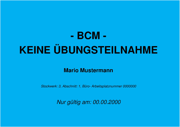 Es gibt Unternehmen, die im Rahmen des BCM Notfallarbeitsplätze an einem anderen Standort vorhalten. Dies soll die Handlungsfähigkeit in Gefahrensituationen bewahren. Mit den betroffenen Führungskräften muss unbedingt kommuniziert werden, dass eine Evakuierungsübung stattfindet und ob in diesem Zusammenhang auch der BCM-Fall geprobt werden soll. Dies ist dann eine eigenständige Übung und sie verläuft parallel zu der eigenen. Im zu begründenden Einzelfall kann entschieden werden, dass einzelne Schlüsselpositionen besetzt bleiben. Es empfiehlt sich, die Plätze bzw. Bereiche, die von der Übung ausgeschlossen sind, zu kennzeichnen. Dabei haben sich farbige Kartonschilder als hilfreich erwiesen, die personalisiert mit Gültigkeitsdatum, kurz vor der Übung ausgegeben werden und erst bei Ertönen des Alarms sichtbar ausgelegt oder -ausgehängt werden (s. Abb. 5). Die von der Übung ausgenommenen Personen sollten eine gesonderte Unterweisung im richtigen Verhalten bei Evakuierung erhalten.