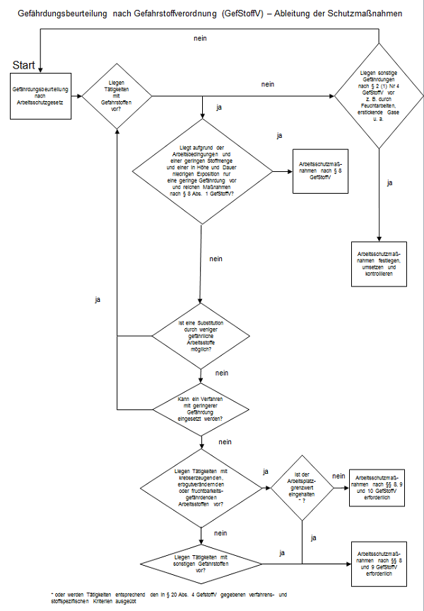 Bereits im Arbeitsschutzgesetz (ArbSchG) § 5 Abs. 1 ist generell die Forderung zur Erstellung einer Gefährdungsbeurteilung aufgeführt. Ergänzend dazu besteht seit dem 01.01.2005 mit Inkrafttreten der 5. novellierten GefStoffV für den Arbeitgeber ohne Übergangsfristen die Pflicht, dann, wenn Tätigkeiten mit Gefahrstoffen durchgeführt werden, eine Gefährdungsbeurteilung nach GefStoffV durchzuführen oder durchführen zu lassen. Diese Gefährdungsbeurteilung ist vor der Aufnahme der Tätigkeiten durchzuführen und sie muss auf jeden Fall, und zwar unabhängig von der Zahl der Beschäftigten, erstellt werden.