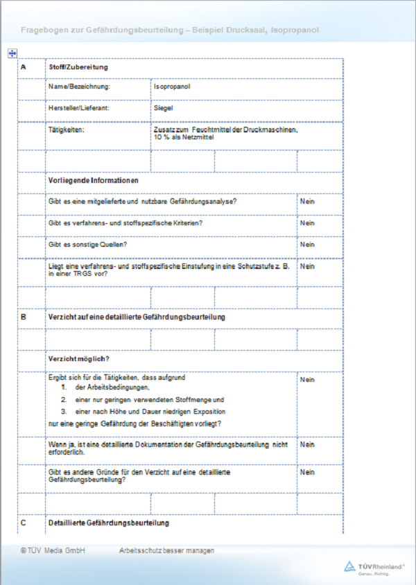 Wenn nur mit einer geringen Gefährdung der Mitarbeiter zu rechnen ist, kann auf eine detaillierte Dokumentation der Gefährdungsbeurteilung verzichtet werden. Eine geringe Gefährdung der Beschäftigten kann aus den Gefahrstoffen zugeordneten Gefährlichkeitsmerkmalen, den Arbeitsbedingungen, der verwendeten Stoffmenge und der Höhe und Dauer der Exposition abgeleitet werden.