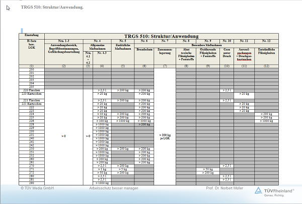 | • | Lagern (i. S. v. § 2 (6) der GefStoffV = Nr. 1 (1) der TRGS 510) von Gefahrstoffen (i. S. v. § 2 (1) der GefStoffV) in ortsbeweglichen Behältern (gemäß Nr. 2 (18) der TRGS 510), die verschlossen sind (gemäß Nr. 4.2 (1) der TRGS 510); |