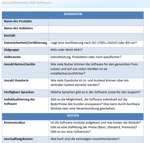 Der Einsatz einer Software zur Steuerung des integrierten Managementsystems (IMS) wird aufgrund der zunehmenden Anforderungen an Managementsysteme und infolge der steigenden Anzahl von Managementsystemen für Organisationen immer zweckmäßiger. Organisationen stehen bei der Auswahl einer geeigneten Software vor Herausforderungen, da viele Anbieter am Markt agieren und auch die Entscheidungskriterien je nach Unternehmen variieren.