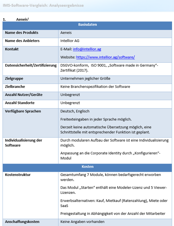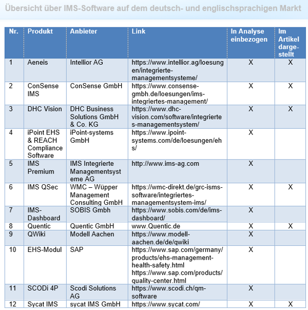 Im Rahmen des Moduls „Softwareanwendungen” der Studiengänge „Integrierte Managementsysteme”/„Integriertes Management” der Hochschule Zittau/Görlitz wurden die gegenwärtigen Anbieter von IMS-Software untersucht und die Analyseergebnisse kriteriengestützt aufbereitet. Dieser Artikel bietet eine Zusammenfassung der Untersuchungsergebnisse und einen Überblick über den aktuellen Markt der IMS-Software.